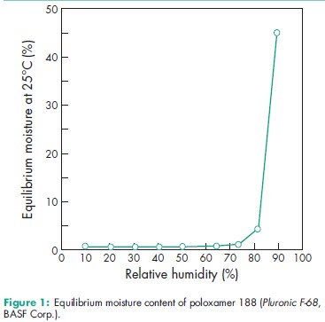 Acidity/alkalinity pH = 5.0–7.4 for a 2.5% w/v aqueous solution. Cloud point >1008C for a 1% w/v aqueous solution, and a 10% w/v aqueous solution of poloxamer 188. Density 1.06 g/cm3 at 258C Flash point 2608C Flowability Solid poloxamers are free flowing. HLB value 0.5–30; 29 for poloxamer 188. Melting point 168C for poloxamer 124; 52–578C for poloxamer 188; 498C for poloxamer 237; 578C for poloxamer 338; 52–578C for poloxamer 407. Moisture content Poloxamers generally contain less than 0.5% w/w water and are hygroscopic only at relative humidity greater than 80%. See also Figure 1. Solubility Solubility varies according to the poloxamer type; see also Table IV. Surface tension 19.8mN/m (19.8 dynes/cm) for a 0.1% w/v aqueous poloxamer 188 solution at 258C; 24.0mN/m (24.0 dynes/cm) for a 0.01% w/v aqueous poloxamer 188 solution at 258C; 26.0mN/m (26.0 dynes/cm) for a 0.001% w/v aqueous poloxamer solution at 258C. Viscosity (dynamic) 1000 mPa s (1000 cP) as a melt at 778C for poloxamer 188.