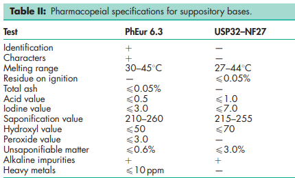 The primary application of hard fat suppository bases, or semisynthetic glycerides, is as a vehicle for the rectal or vaginal administration of a variety of drugs, either to exert local effects or to achieve systemic absorption. Selection of a suppository base cannot usually be made in the absence of knowledge of the physicochemical properties and intrinsic thermodynamic activity of the drug substance. Other drug-related factors that can affect release and absorption and which must therefore be considered are the particle size distribution of insoluble solids, the oil : water partition coefficient, and the dissociation constant. The displacement value should also be known, as well as the ratio of drug to base. Properties of the suppository base that may or may not be modified by the drug, or that can influence drug release, are the melting characteristics, chemical reactivity, and rheology. The presence of additives in the base can also affect performance. Melting characteristics Fatty-based suppositories intended for systemic use should liquefy at just below body temperature. Softening or dispersion may be adequate for suppositories intended for local action or modified release. High-melting-point bases may be indicated for fat-soluble drugs that tend to depress the melting point of bases or for suppositories used in warm climates. Drugs that dissolve in bases when hot may create problems if they deposit as crystals of different form or increased size on cooling or on storage. Low-melting-point bases, particularly those that melt to liquids of low viscosity, can be of value when large volumes of insoluble substances are to be incorporated; there is a risk of sedimentation in such instances. An important factor during processing is the time required for setting. This is affected by the temperature difference between the melting point and the solidification point.(1,2) Chemical reactivity Although the use of bases with low hydroxyl values (low partial ester content) is indicated to minimize the risk of interaction with chemically reactive compounds, formulators should be aware that hydroxyl values are also related to hydrophilic properties, which, in turn, can modify both release and absorption rates. Bases with low hydroxyl values tend to be less plastic than those with higher values and, if cooled rapidly, may become excessively brittle. Peroxide values give a measure of the resistance of the base to oxidation and are a guide to the onset of rancidity. Rheology The viscosity of the melted base can affect the uniformity of distribution of suspended solids during manufacture. It can also influence the release and absorption of the drug in the rectum. Further reduction in the particle size of insoluble solids is the method of choice to minimize the risk of sedimentation. However, the presence of a high content of fine, suspended particles is likely to increase viscosity. It may also make pouring difficult, delay melting, and induce brittleness on solidification. Additives are sometimes included to modify rheological properties and to maintain homogeneity, e.g. microcrystalline wax, but the extent of their effect on drug release should first be assessed. Release from a base in which viscosity has been enhanced by an added thickener may vary and be related to the aqueous solubility of the drug itself. Additives Some grades of commercial bases already contain additives, and these are usually identified by the manufacturers by means of suitable letters and numbers. Additives may also be incorporated by formulators. Properties of suppositories that have been modified and additives or types of additives that have been used are shown in Table I. Water is undesirable as an additive because it enhances hydrolysis and the potential for a chemical reaction between constituents of the suppository. In low concentration, water plays little part in drug release and can serve as a medium for microbial growth.