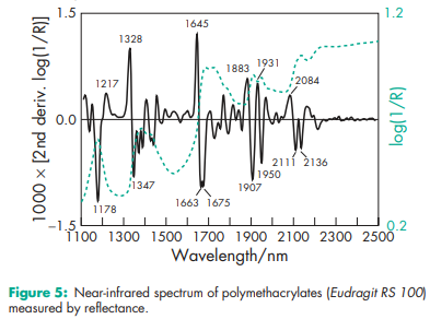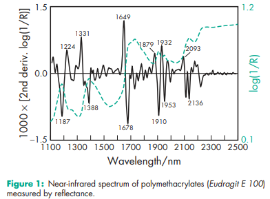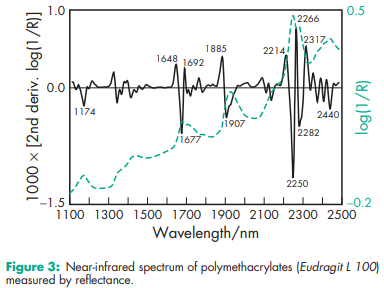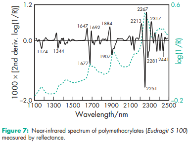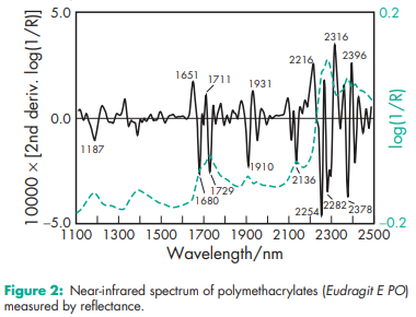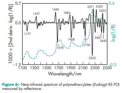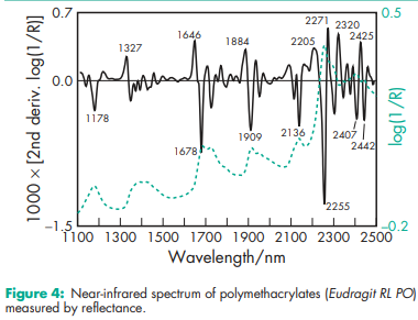 Acid value 300–330 for Eudragit L 12.5, L 12.5 P, L 100, L 30 D-55, L 100-55, Eastacryl 30 D, Kollicoat MAE 100 P, and Kollicoat MAE 30 DP; 180–200 for Eudragit S 12.5, S 12.5 P, and S 100. Alkali value 162–198 for Eudragit E 12.5 and E 100; 23.9–32.3 for Eudragit RL 12.5, RL 100, and RL PO; 27.5–31.7 for Eudragit RL 30 D; 12.1–18.3 for Eudragit RS 12.5, RS 100, and RS PO; 16.5–22.3 for Eudragit RS 30 D. Density (bulk) 0.390 g/cm3 Density (tapped) 0.424 g/cm3 Density (true) 0.811–0.821 g/cm3 for Eudragit E; 0.83–0.85 g/cm3 for Eudragit L, S 12.5 and 12.5 P; 1.058–1.068 g/cm3 for Eudragit FS 30 D; 0.831–0.852 g/cm3 for Eudragit L, S 100; 1.062–1.072 g/cm3 for Eudragit L 30 D-55; 0.821–0.841 g/cm3 for Eudragit L 100-55; 0.816–0.836 g/cm3 for Eudragit RL and RS 12.5; 0.816–0.836 g/cm3 for Eudragit RL and RS PO; 1.047–1.057 g/cm3 for Eudragit RL and RS 30 D; 1.037–1.047 g/cm3 for Eudragit NE 30 D; 1.062–1.072 g/cm3 for Eastacryl 30 D; 1.062–1.072 g/cm3 for Kollicoat MAE 100 P and Kollicoat MAE 30 DP. NIR spectra see Figures 1, 2, 3, 4, 5, 6, and 7. Refractive index nD 20 = 1.38–1.385 for Eudragit E; nD 20 = 1.39–1.395 for Eudragit L and S; nD 20 = 1.387–1.392 for Eudragit L 100-55; nD 20 = 1.38–1.385 for Eudragit RL and RS. Solubility see Table III. Viscosity (dynamic) 3–12 mPa s for Eudragit E; 450 mPa s for Eudragit NE 30 D; 50–200 mPa s for Eudragit L and S; 420 mPa s for Eudragit FS 30 D; 415 mPa s for Eudragit L 30 D-55; 100–200 mPa s for Eudragit L 100-55; 415 mPa s for Eudragit RL and RS; 4200 mPa s for Eudragit RL and RS 30 D; 415 mPa s for Kollicoat MAE 100 P and Kollicoat MAE 30 DP; 145 mPa s for Eastacryl 30D.