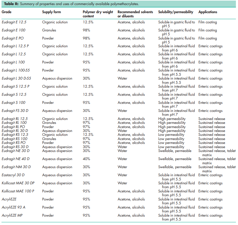 Polymethacrylates are primarily used in oral capsule and tablet formulations as film-coating agents.(1–21) Depending on the type of polymer used, films of different solubility characteristics can be produced; see Table II. Eudragit E is used as a plain or insulating film former. It is soluble in gastric fluid below pH 5. In contrast, Eudragit L, S and FS types are used as enteric coating agents because they are resistant to gastric fluid. Different types of enteric coatings are soluble at different pH values: e.g. Eudragit L is soluble at pH > 6 whereas Eudragit S and FS are soluble at pH > 7. The S grade is generally used for coating tablets, while the flexible FS 30 D dispersion is preferred for coating particles. Eudragit RL, RS, NE 30 D, NE 40 D, and NM 30 D are used to form water-insoluble film coats for sustained-release products. Eudragit RL films are more permeable than those of Eudragit RS, and films of varying permeability can be obtained by mixing the two types together. The neutral Eudragit NE/NM grades do not have functional ionic groups. They swell in aqueous media independently of pH without dissolving. Eudragit L 30 D-55 is used as an enteric coating film former for solid-dosage forms. The coating is resistant to gastric juice but dissolves readily at above pH 5.5. Eudragit L 100-55 is an alternative to Eudragit L 30 D-55. It is commercially available as a redispersible powder. Kollicoat MAE 100 P, Acryl-EZE and Acryl-EZE MP are also commercially available as redispersible powder forms, which are designed for enteric coating of tablets or beads. Eastacryl 30 D and Kollicoat MAE 30 DP are aqueous dispersions of methacrylic acid–ethyl acrylate copolymers. They are also used as enteric coatings for solid-dosage forms. Polymethacrylates are also used as binders in both aqueous and organic wet-granulation processes. Larger quantities (5–20%) of dry polymer are used to control the release of an active substance from a tablet matrix. Solid polymers may be used in directcompression processes in quantities of 10–50%. Polymethacrylate polymers may additionally be used to form the matrix layers of transdermal delivery systems and have also been used to prepare novel gel formulations for rectal administration.(22