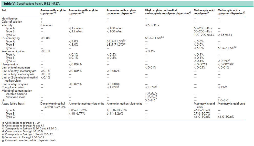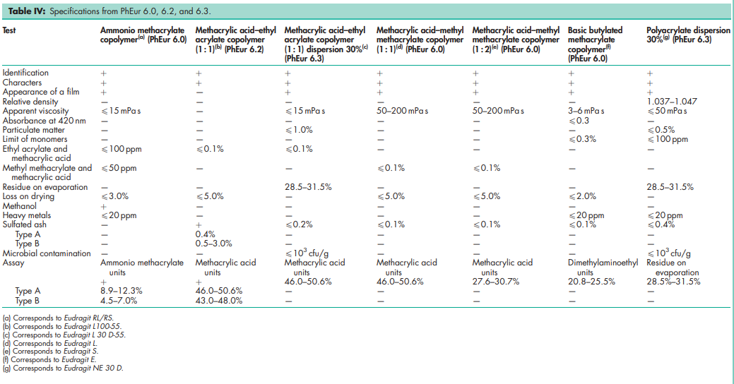 Specifications for polymethacrylates from PhEur 6.0, 6.2, and 6.3 are shown in Table IV, and those from the USP32–NF27 in Table V.