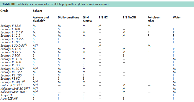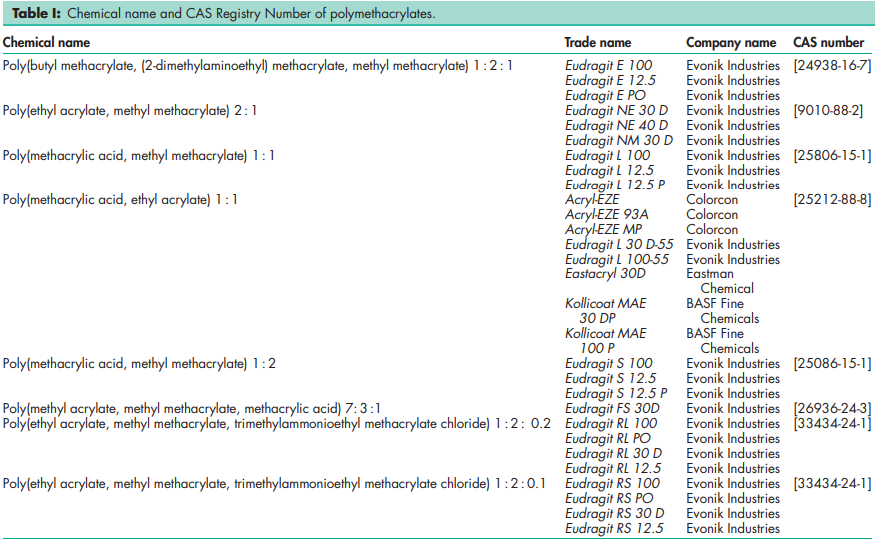 Polymethacrylates are synthetic cationic and anionic polymers of dimethylaminoethyl methacrylates, methacrylic acid, and methacrylic acid esters in varying ratios. Several different types are commercially available and may be obtained as the dry powder, as an aqueous dispersion, or as an organic solution. A (60 : 40) mixture of acetone and propan-2-ol is most commonly used as the organic solvent. See Tables I and III. Eudragit E is a cationic polymer based on dimethylaminoethyl methacrylate and other neutral methacrylic acid esters. It is soluble in gastric fluid as well as in weakly acidic buffer solutions (up to pH 5). Eudragit E is available as a 12.5% ready-to-use solution in propan-2-ol–acetone (60 : 40). It is light yellow in color with the characteristic odor of the solvents. Solvent-free granules contain 98% dried weight content of Eudragit E. Eudragit E PO is a white free-flowing powder with at least 95% of dry polymer. Eudragit L and S, also referred to as methacrylic acid copolymers in the USP32–NF27 monograph, are anionic copolymerization products of methacrylic acid and methyl methacrylate. The ratio of free carboxyl groups to the ester is approximately 1 : 1 in Eudragit L (Type A) and approximately 1 : 2 in Eudragit S (Type B). Both polymers are readily soluble in neutral to weakly alkaline conditions (pH 6–7) and form salts with alkalis, thus affording film coats that are resistant to gastric media but soluble in intestinal fluid. They are available as a 12.5% solution in propan-2-ol without plasticizer (Eudragit L 12.5 and S 12.5); and as a 12.5% ready-to-use solution in propan-2-ol with 1.25% dibutyl phthalate as plasticizer (Eudragit L 12.5 P and S 12.5 P). Solutions are colorless, with the characteristic odor of the solvent. Eudragit L - 100 and Eudragit S-100 are white free-flowing powders with at least 95% of dry polymers. Eudragit FS 30 D is the aqueous dispersion of an anionic copolymer based on methyl acrylate, methyl methacrylate, and methacrylic acid. The ratio of free carboxyl groups to ester groups is approximately 1 : 10. It is a highly flexible polymer, designed for use in enteric-coated solid-dosage forms, and dissolves in aqueous systems at pH >7. Eudragit RL and Eudragit RS, also referred to as ammonio methacrylate copolymers in the USP32–NF27 monograph, are copolymers synthesized from acrylic acid and methacrylic acid esters, with Eudragit RL (Type A) having 10% of functional.