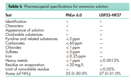 Strong ammonia solution occurs as a clear, colorless liquid having an exceedingly pungent, characteristic odor. The PhEur 6.0 states that concentrated ammonia solution contains not less than 25.0% and not more than 30.0% w/w of ammonia (NH3). The USP32– NF27 states that strong ammonia solution contains not less than 27.0% and not more than 31.0% w/w of ammonia (NH3). See also Section 17.