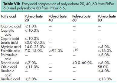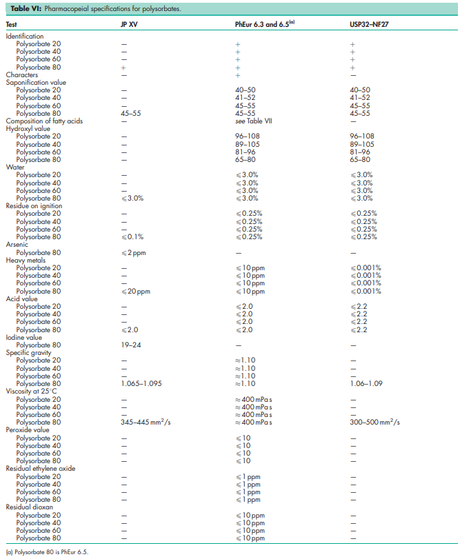BP: Polysorbate 20 Polysorbate 40 Polysorbate 60 Polysorbate 80 JP: Polysorbate 80 PhEur: Polysorbate 20 Polysorbate 40 Polysorbate 60 Polysorbate 80 USP-NF: Polysorbate 20 Polysorbate 40 Polysorbate 60 Polysorbate 80