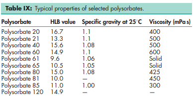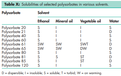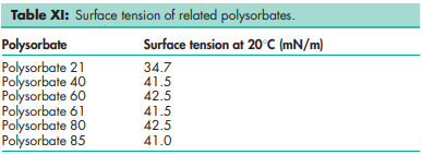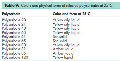 Polysorbates have a characteristic odor and a warm, somewhat bitter taste. Their colors and physical forms at 258C are shown in Table V, although it should be noted that the absolute color intensity of the products may vary from batch to batch and from manufacturer to manufacturer.
