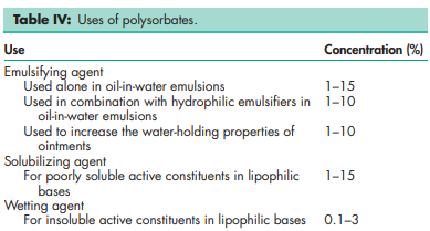 Polyoxyethylene sorbitan fatty acid esters (polysorbates) are a series of partial fatty acid esters of sorbitol and its anhydrides copolymerized with approximately 20, 5, or 4 moles of ethylene oxide for each mole of sorbitol and its anhydrides. The resulting product is therefore a mixture of molecules of varying sizes rather than a single uniform compound. Polysorbates containing 20 units of oxyethylene are hydrophilic nonionic surfactants that are used widely as emulsifying agents in the preparation of stable oil-in-water pharmaceutical emulsions. They may also be used as solubilizing agents for a variety of substances including essential oils and oil-soluble vitamins, and as wetting agents in the formulation of oral and parenteral suspensions. They have been found to be useful in improving the oral bioavailability of drug molecules that are substrates for Pglycoprotein.(1,2) Polysorbates are also widely used in cosmetics and food products.