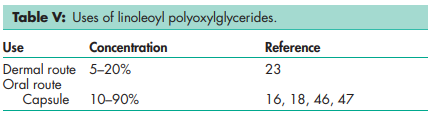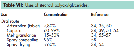 Polyoxylglycerides are used as self-emulsifying and solubilizing agents in oral and topical pharmaceutical formulations. They are also used in cosmetic and food products. See also Tables III, IV, V, VI, and VII.
