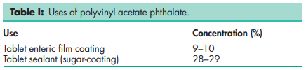 Polyvinyl acetate phthalate reacts with povidone to form an insoluble complex that precipitates out of solution;(9) benzocaine is also incompatible with polyvinyl acetate phthalate.(10) Erythromycin disperses in polyvinyl acetate phthalate and has been shown to be physically stable(11) while omeprazole exists in the amorphous form in polyvinyl acetate phthalate coatings with no evidence of interaction.(12)