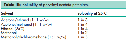The characteristics of polyvinyl acetate phthalate from two sources have been compared; values for molecular weight (60 700; 47 000), moisture content (3.74%; 2.20%) and density (1.31 g/cm3 ; 1.37 g/cm3 ) have been reported. The solubility of each polyvinyl acetate phthalate in a range of different solvents was described and scanning electron photomicrographs were produced to give evidence of the different polymer morphology.(8) Glass transition temperature A glass transition temperature of 42.58C has been reported for polyvinyl acetate phthalate; the glass transition temperature was shown to fall with the addition of increasing amounts of the plasticizer diethyl phthalate.(7) Solubility Soluble in ethanol and methanol; sparingly soluble in acetone and propan-2-ol; practically insoluble in chloroform, dichloromethane, and water. In buffer solutions, polyvinyl acetate phthalate (200 mg/L) is insoluble below pH 5 and becomes soluble at pH values above 5. Polyvinyl acetate pththalate shows a sharp solubility response with pH; this occurs at pH 4.5–5.0, which is lower than for most other polymers used for enteric coatings. Solubility is also influenced by ionic strength. See Table III.Viscosity (dynamic) The viscosity of a solution of polyvinyl acetate phthalate/methanol (1 : 1) is 5000 mPa s. In methanol/ dichloromethane systems, viscosity increases as the concentration of methanol in the system increases.