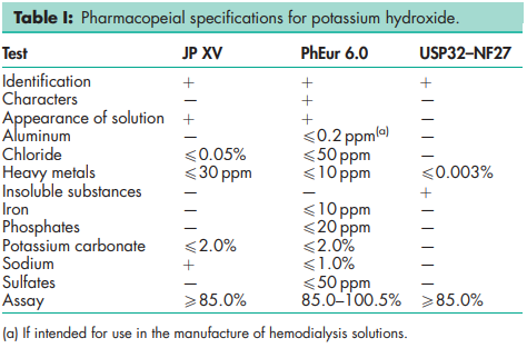 BP: Potassium Hydroxide JP: Potassium Hydroxide PhEur: Potassium Hydroxide USP-NF: Potassium Hydroxide