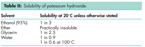 Acidity/alkalinity pH = 13.5 (0.1 M aqueous solution) Melting point 3608C; 3808C when anhydrous Solubility see Table II.