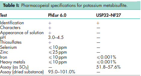 BP: Potassium Metabisulphite PhEur: Potassium Metabisulphite USP-NF: Potassium Metabisulfite