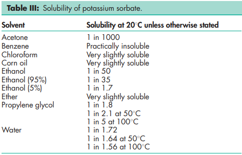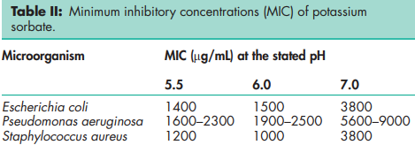 Antimicrobial activity Potassium sorbate is predominantly used as an antifungal preservative, although it also has antibacterial properties. Similarly to sorbic acid, the antimicrobial activity is dependent on the degree of dissociation; there is practically no antibacterial activity above pH 6. Preservative efficacy is increased with increasing temperature,(2) and increasing concentration of potassium sorbate.(2) The efficacy of potassium sorbate is also increased when used in combination with other antimicrobial preservatives or glycols since synergistic effects occur.(3) Reported minimum inhibitory concentrations (MICs) at the pH values indicated are shown in Table II.(3)