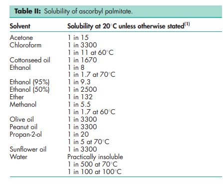 Ascorbyl palmitate is primarily used either alone or in combination with alpha tocopherol as a stabilizer for oils in oral pharmaceutical formulations and food products; generally 0.05% w/v is used. It may also be used in oral and topical preparations as an antioxidant for drugs unstable to oxygen. The combination of ascorbyl palmitate with alpha tocopherol shows marked synergism, which increases the effect of the components and allows the amount used to be reduced. The solubility of ascorbyl palmitate in alcohol permits it to be used in nonaqueous and aqueous systems and emulsions.