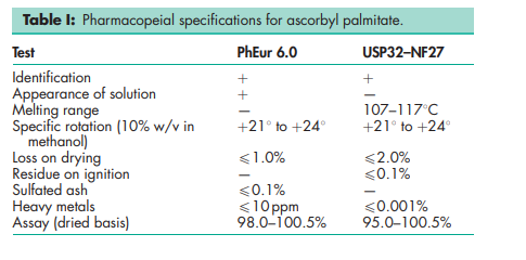 BP: Ascorbyl Palmitate PhEur: Ascorbyl Palmitate USP-NF: Ascorbyl Palmitate
