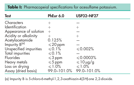 BP: Acesulfame Potassium PhEur: Acesulfame Potassium USP-NF: Acesulfame Potassium