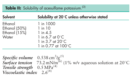 Theperceivedintensityof sweeteners relative tosucrosedepends upontheirconcentration, temperatureof tasting,andpH,andon theflavorandtextureoftheproductconcerned. Intensesweeteningagentswillnotreplacethebulk, textural,or preservative characteristics of sugar, if sugar is removed froma formulation. Synergistic effects for combinations of sweeteners have been reported, e.g. acesulfame potassiumwith aspartame or sodium cyclamate; seealsoAspartame.Aternarycombinationof sweet enersthatincludesacesulfamepotassiumandsodiumsaccharinhas agreaterdecrease insweetnessuponrepeatedtastingthanother combinations.(10) Note that free acesulfame acid is not suitable for use as a sweetener. Aspecification for acesulfamepotassiumis contained in the FoodChemicalsCodex(FCC).(11)