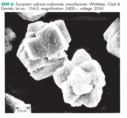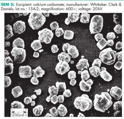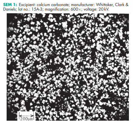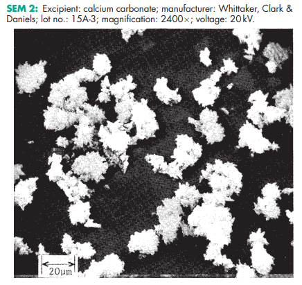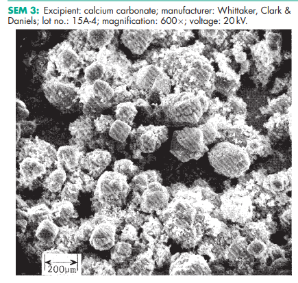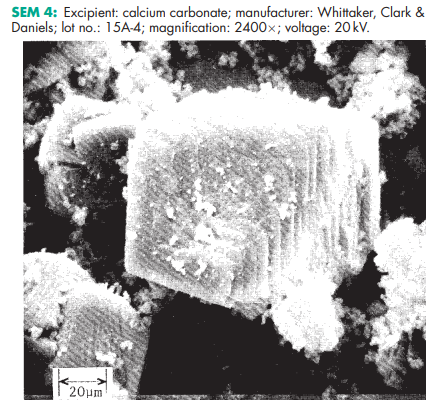 Calcium carbonate is stable and should be stored in a well-closed container in a cool, dry place. SEM 1: Excipient: calcium carbonate; manufacturer: Whittaker, Clark & Daniels; lot no.: 15A-3; magnification: 600; voltage: 20 kV. SEM 2: Excipient: calcium carbonate; manufacturer: Whittaker, Clark & Daniels; lot no.: 15A-3; magnification: 2400; voltage: 20 kV. SEM 3: Excipient: calcium carbonate; manufacturer: Whittaker, Clark & Daniels; lot no.: 15A-4; magnification: 600; voltage: 20 kV. SEM 4: Excipient: calcium carbonate; manufacturer: Whittaker, Clark & Daniels; lot no.: 15A-4; magnification: 2400; voltage: 20 kV. SEM 5: Excipient: calcium carbonate; manufacturer: Whittaker, Clark & Daniels; lot no.: 15A-2; magnification: 600; voltage: 20 kV. SEM 6: Excipient: calcium carbonate; manufacturer: Whittaker, Clark & Daniels; lot no.: 15A-2; magnification: 2400; voltage: 20 kV.