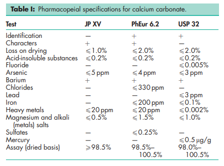 BP: Calcium Carbonate JP: Precipitated Calcium Carbonate PhEur: Calcium Carbonate USP: Calcium Carbonate
