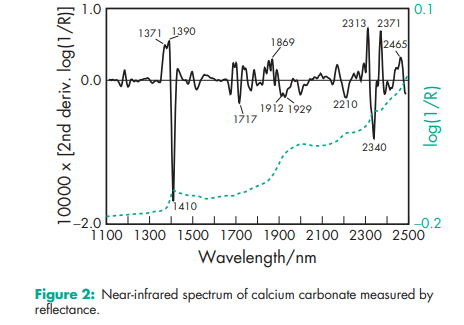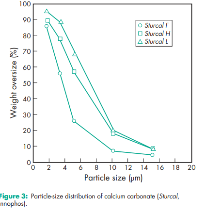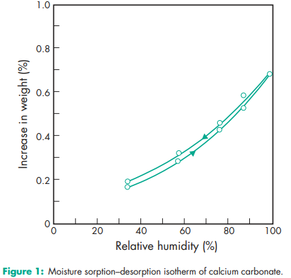 Acidity/alkalinity pH = 9.0 (10% w/v aqueous dispersion) Density (bulk) 0.8 g/cm3 Density (tapped) 1.2 g/cm3 Flowability Cohesive. Hardness (Mohs) 3.0 for Millicarb. Melting point Decomposes at 8258C. Moisture content see Figure 1. NIR spectra see Figure 2. Particle size see Figure 3. Refractive index 1.59 Solubility Practically insoluble in ethanol (95%) and water. Solubility in water is increased by the presence of ammonium salts or carbon dioxide. The presence of alkali hydroxides reduces solubility. Specific gravity 2.7 Specific surface area 6.21–6.47 m2 /g