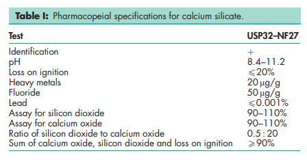 The USP32–NF27 describes the material as containing not less than 4% of calcium oxide and not less than 35% of silicon dioxide. See Table I.