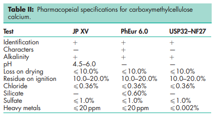 Carboxymethylcellulose calcium is one of the materials that have been selected for harmonization by the Pharmacopeial Discussion Group. For further information see the General Information Chapter <1196> in the USP32–NF27, the General Chapter 5.8 in PhEur 6.0, along with the ‘State of Work’ document on the PhEur EDQM website, and also the General Information Chapter 8 in the JP XV.