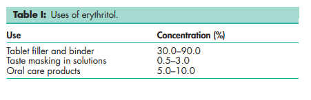 Erythritol is a naturally occurring noncariogenic excipient used in a variety of pharmaceutical preparations, including in solid dosage forms as a tablet filler,(1) and in coatings.(2) It has also been investigated for use in dry powder inhalers.(3,4) It is also used in sugar-free lozenges,(5,6) and medicated chewing gum.(5 Erythritol can also be used as a diluent in wet granulation in combination with moisture-sensitive drugs.(7) In buccal applications, such as medicated chewing gums, it is used because of its high negative heat of solution which provides a strong cooling effect. Erythritol is also used as a noncaloric sweetener in syrups;(8) it is used to provide sensorial profile-modifying properties with intense sweeteners; and it is also used to mask unwanted aftertastes. Erythritol is also used as a noncariogenic sweetener in toothpastes and mouthwash solutions. See Table I.