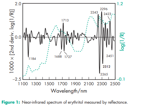 Acidity/alkalinity pH = 5–7 at 258C for a 5% w/v aqueous solution. Boiling point 329–3318C Caloric value 0.8 kJ/g Density 1.45 g/cm3 Dissociation constant pKa = 13.90 at 188C Heat of solution 22 kJ/mol Hygroscopicity Erythritol is nonhygroscopic; it absorbs approximately 1% w/w of water at 95% relative humidity (RH). Melting point 121.58C, with decomposition at 1608C. NIR spectra see Figure 1. Solubility Soluble 1 in 3 of water; slightly soluble in ethanol (95%); practically insoluble in ether and fats. Viscosity (dynamic) 3 mPa s (3 cP) at 608C for a 30% w/w solution.