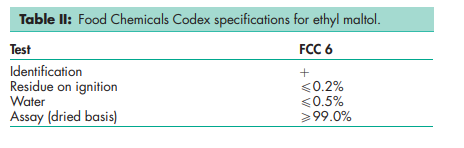See Maltol for further information. Although not included in any pharmacopeias, a specification for ethyl maltol is contained in the Food Chemicals Codex (FCC), see Table II.(5)