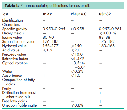BP: Virgin Castor Oil JP: Castor Oil PhEur: Castor Oil, Virgin USP: Castor Oil
