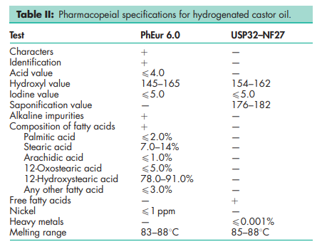 BP: Hydrogenated Castor Oil PhEur: Castor Oil, Hydrogenated USP-NF: Hydrogenated Castor Oil