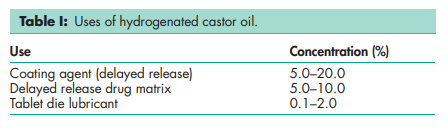 Hydrogenated castor oil is a hard wax with a high melting point used in oral and topical pharmaceutical formulations; see Table I. In topical formulations, hydrogenated castor oil is used to provide stiffness to creams and emulsions.(1) In oral formulations, hydrogenated castor oil is used to prepare sustained-release tablet and capsule preparations;(2,3) the hydrogenated castor oil may be used as a coat or to form a solid matrix. Hydrogenated castor oil is additionally used to lubricate the die walls of tablet presses;(4,5) and is similarly used as a lubricant in food processing. Hydrogenated castor oil is also used in cosmetics.