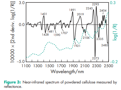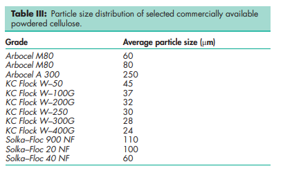 Angle of repose <628 for Arbocel M80; <498 for Arbocel P 290; <368 for Arbocel A 300. Density (bulk) 0.15–0.39 g/cm3 , depending on the source and grade. Density (tapped) 0.21–0.48 g/cm3 , depending on the source and grade. Density (true) 1.47–1.51 g/cm3 (5) depending on source and grade; 1.27–1.61 g/cm3 (6) depending on source and grade. Moisture content Powdered cellulose is slightly hygroscopic;(7) NIR spectra see Figure 3. Particle size distribution Powdered cellulose is commercially available in several different particle sizes; see Table III. Solubility Practically insoluble in water, dilute acids, and most organic solvents, although it disperses in most liquids. Slightly soluble in 5% w/v sodium hydroxide solution. Powdered cellulose does not swell in water, but does so in dilute sodium hypochlorite (bleach).