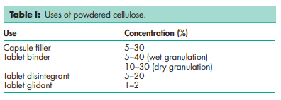 Powdered cellulose is used as a tablet diluent and filler in two-piece hard capsules; see Table I. In both contexts it acts as a bulking agent to increase the physical size of the dosage form for formulations containing a small amount of active substance. Powdered cellulose has acceptable compression properties, although the flow properties of most brands are poor. However, low-crystallinity powdered cellulose has exhibited properties that are different from standard powdered cellulose materials, and has shown potential as a direct-compression excipient.(1) In soft gelatin capsules, powdered cellulose may be used to reduce the sedimentation rate of oily suspension fills. It is also used as the powder base material of powder dosage forms, and as a suspending agent in aqueous suspensions for peroral delivery. It may also be used to reduce sedimentation during the manufacture of suppositories. Powdered cellulose has been investigated as an alternative to microcrystalline cellulose as an agent to assist the manufacture of pellets by extrusion/spheronization.(2,3) However, powdered cellulose alone requires too much water and due to water movement during extrusion cannot be used as an extrusion/spheronization aid on its own.(4) Powdered cellulose is also used widely in cosmetics and food products as an adsorbent and thickening agent.
