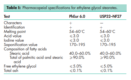 The USP32–NF27 and PhEur 6.0 describe ethylene glycol stearates as a mixture of ethylene glycol monoesters and diesters of stearic and palmitic acids, containing not less than 50% of monoesters produced from the condensation of ethylene glycol and stearic acid, of vegetable or animal origin. Ethylene glycol stearates occur as a white or almost white waxy solid.