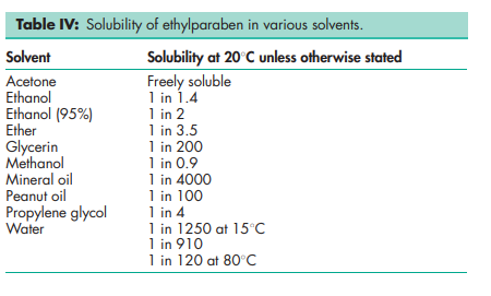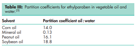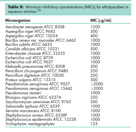 Antimicrobial activity Ethylparaben exhibits antimicrobial activity from pH 4–8. Preservative efficacy decreases with increasing pH owing to the formation of the phenolate anion. Parabens are more active against yeasts and molds than against bacteria. They are also more active against Gram-positive than against Gram-negative bacteria. The activity of the parabens increases with increasing chain length of the alkyl moiety, but solubility decreases. Activity may be improved by using combinations of parabens since synergistic effects occur. Ethylparaben is commonly used with methylparaben and propylparaben in oral and topical formulations (such mixtures are commercially available; for example, Nipasept (Nipa Laboratories Inc.). Activity has also been reported to be improved by the addition of other excipients; see Methylparaben for further information. See Table II for minimum inhibitory concentrations of ethylparaben.(2) Boiling point 297–2988C with decomposition. Melting point 115–1188C NIR spectra see Figure 1. Partition coefficient The values for different vegetable oils vary considerably and are affected by the purity of the oil; see Table III.(3) Solubility see Table IV.